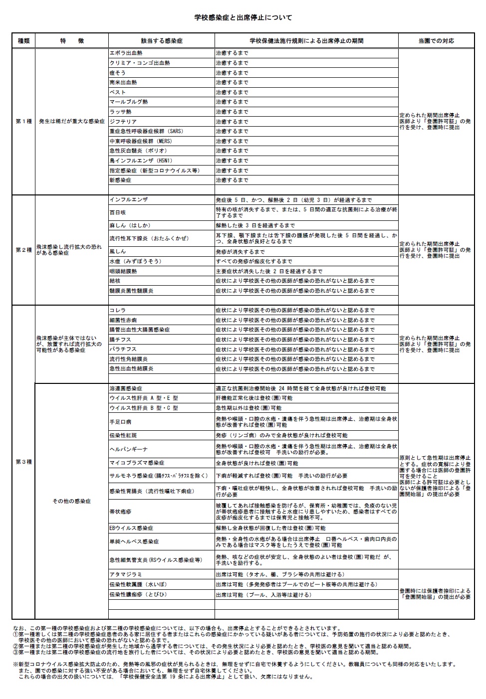 学校保健安全法施行規則第 19 条第 2 項 インフルエンザ(新型インフルエンザ・鳥インフルエンザ等を除く)の出席停止期間 には、『発症した後 5 日を経過し、かつ、解熱した後 2 日(幼児にあっては 3 日)を経過するまで』とされています。必ず医療機関の指示に従っていただき、インフルエンザの場合には、発祥の翌日から5日(解熱してから3日を経過していること)は必ずお休みしていただき、登園する際には、連絡帳に、発症した日と解熱した日をご記入の上、担任までご提出いただけますよう、お願いいたします。 |